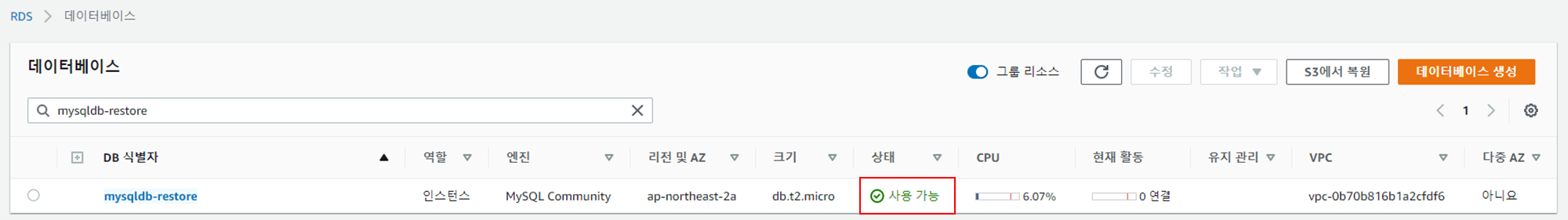 | 7 | 복제 DB 생성 확인 | AWS 콘솔에서 복제 DB 생성 내역 확인 | mysqldb_restore |