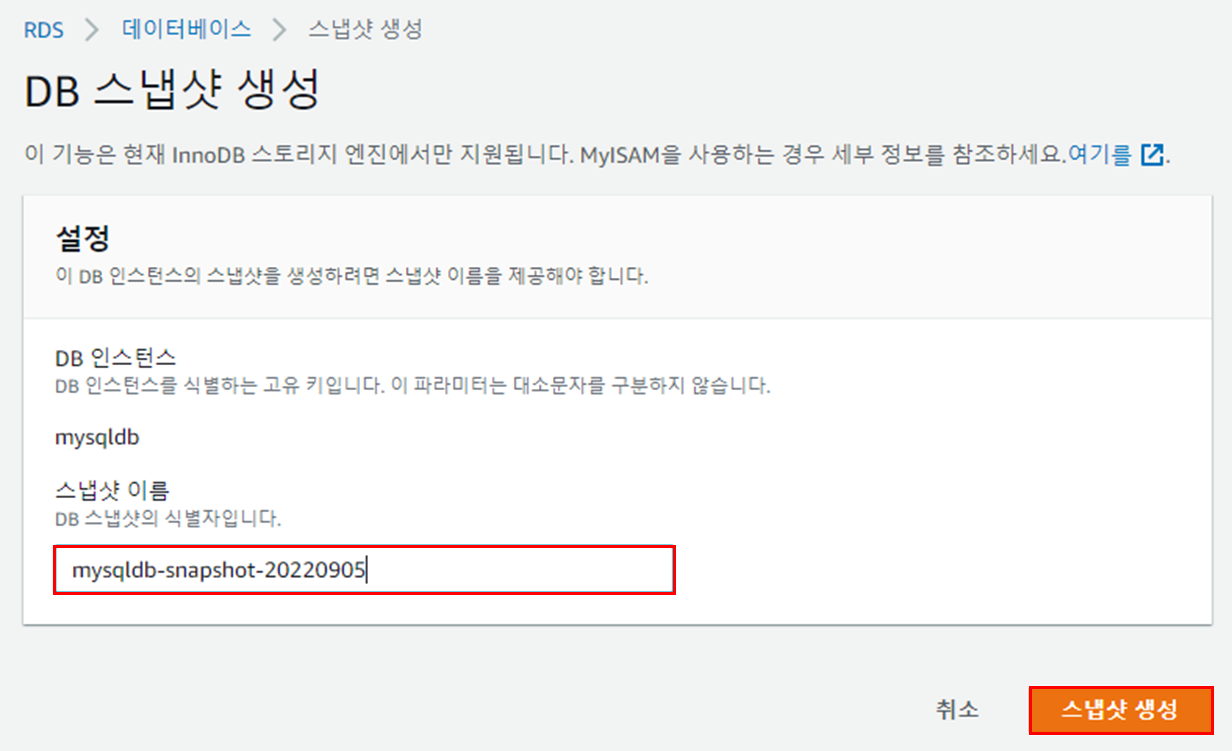 스냅샷 이름 입력 후 '스냅샷 생성' 버튼을 클릭한다.