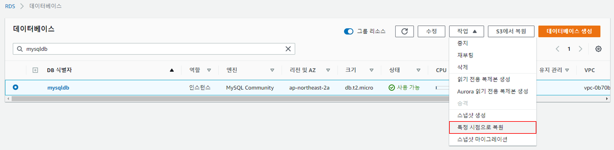 복원하고자 하는 DB 또는 클러스터를 선택 후 '특정 시점으로 복원' 을 선택한다.