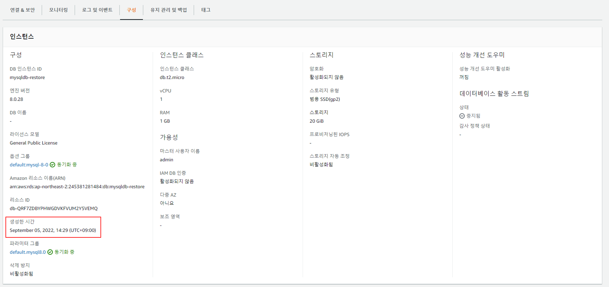 실제 복구 시 원본 DB와 동일한 인스턴스 크기를 선택하고 복구 테스트 시에는 작은 크기를 선택하여 수행한다. 만약 실제 복구 상황이라고 한다면 복제 DB 를 생성 후 인스턴스명을 원본 DB 명으로 변경하는 작업을 진행해야 한다.